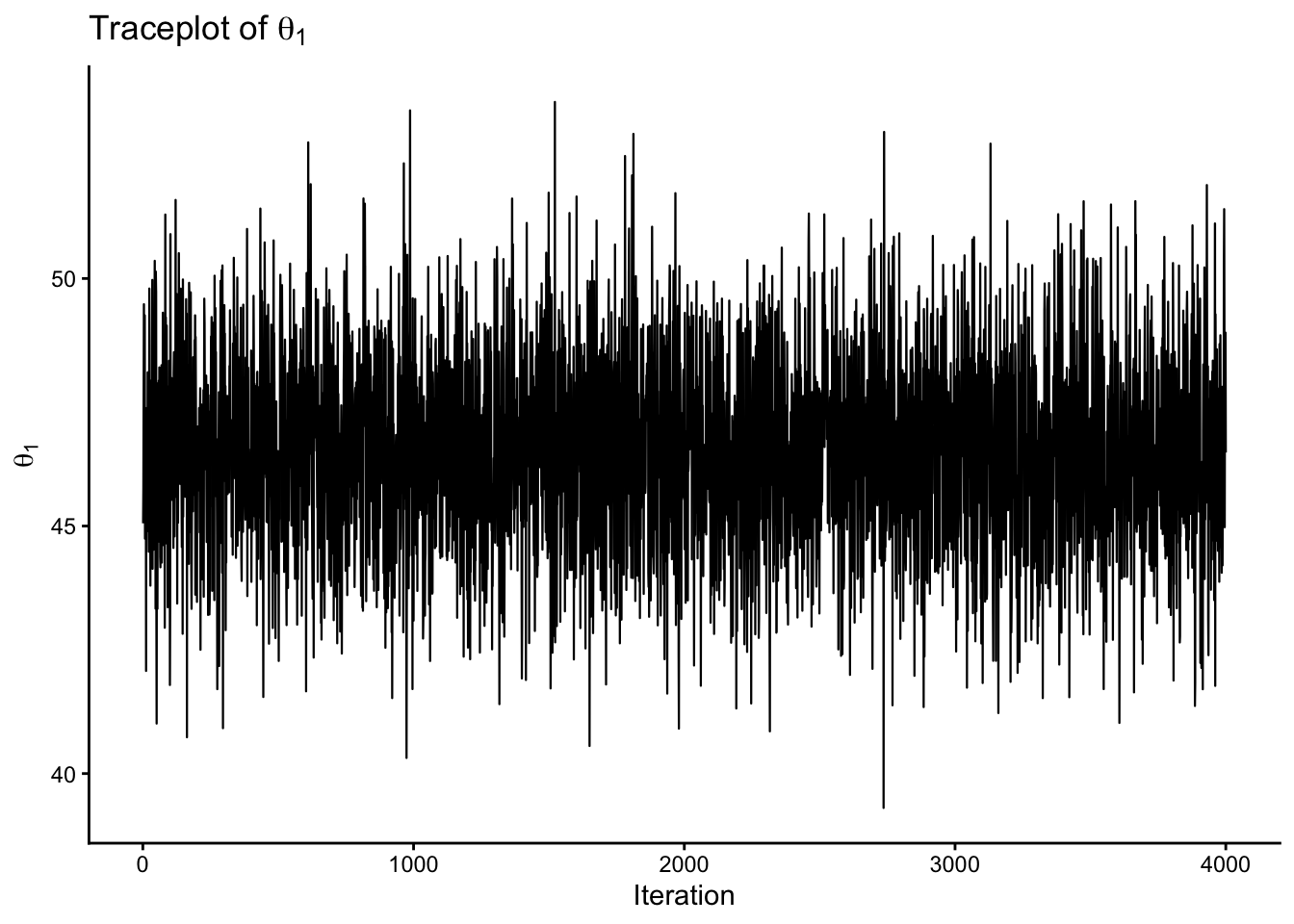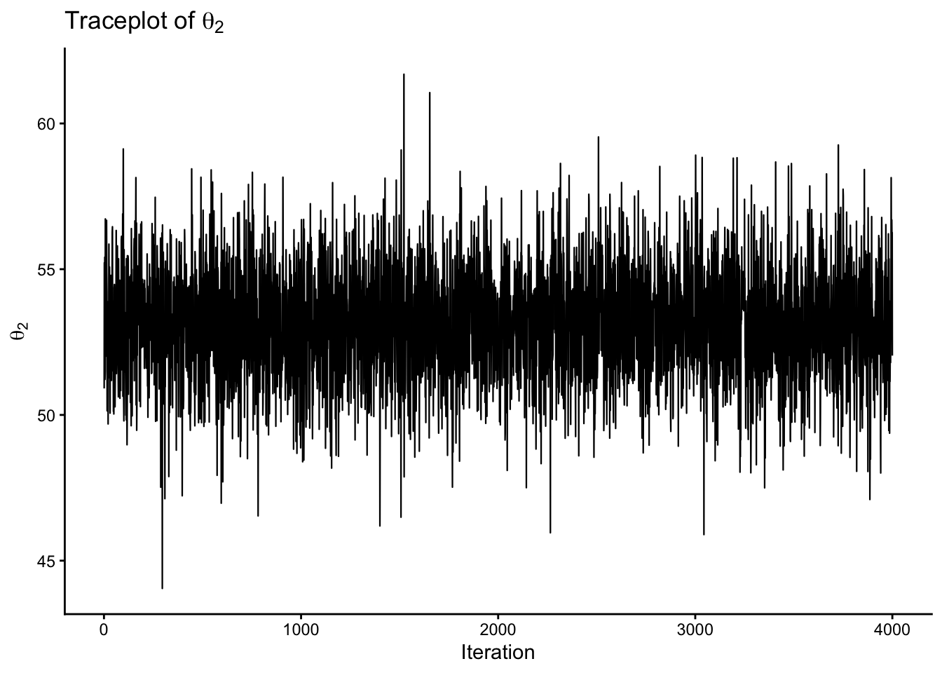 trace_df <-data.frame(iter =1:S,theta1 = THETA[, 1],theta2 = THETA[, 2])p1 <-ggplot(trace_df, aes(x = iter, y = theta1)) +geom_line(linewidth =0.4) +labs(x ="Iteration", y =expression(theta[1]), title =expression("Traceplot of "* theta[1])) +theme_classic()p2 <-ggplot(trace_df, aes(x = iter, y = theta2)) +geom_line(linewidth =0.4) +labs(x ="Iteration", y =expression(theta[2]), title =expression("Traceplot of "* theta[2])) +theme_classic()p1p2