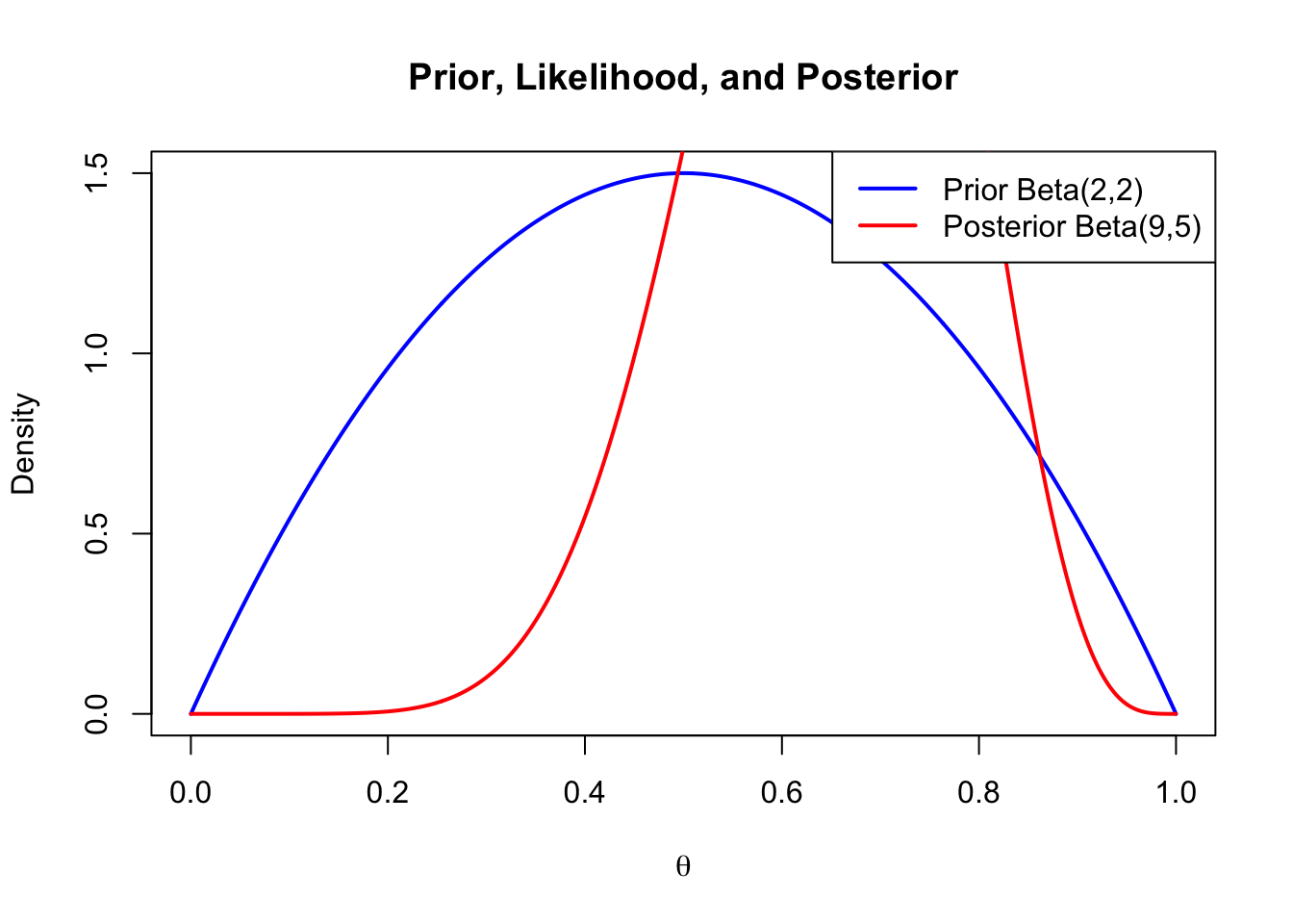 legend=c("Prior Beta(2,2)", "Posterior Beta(9,5)"),