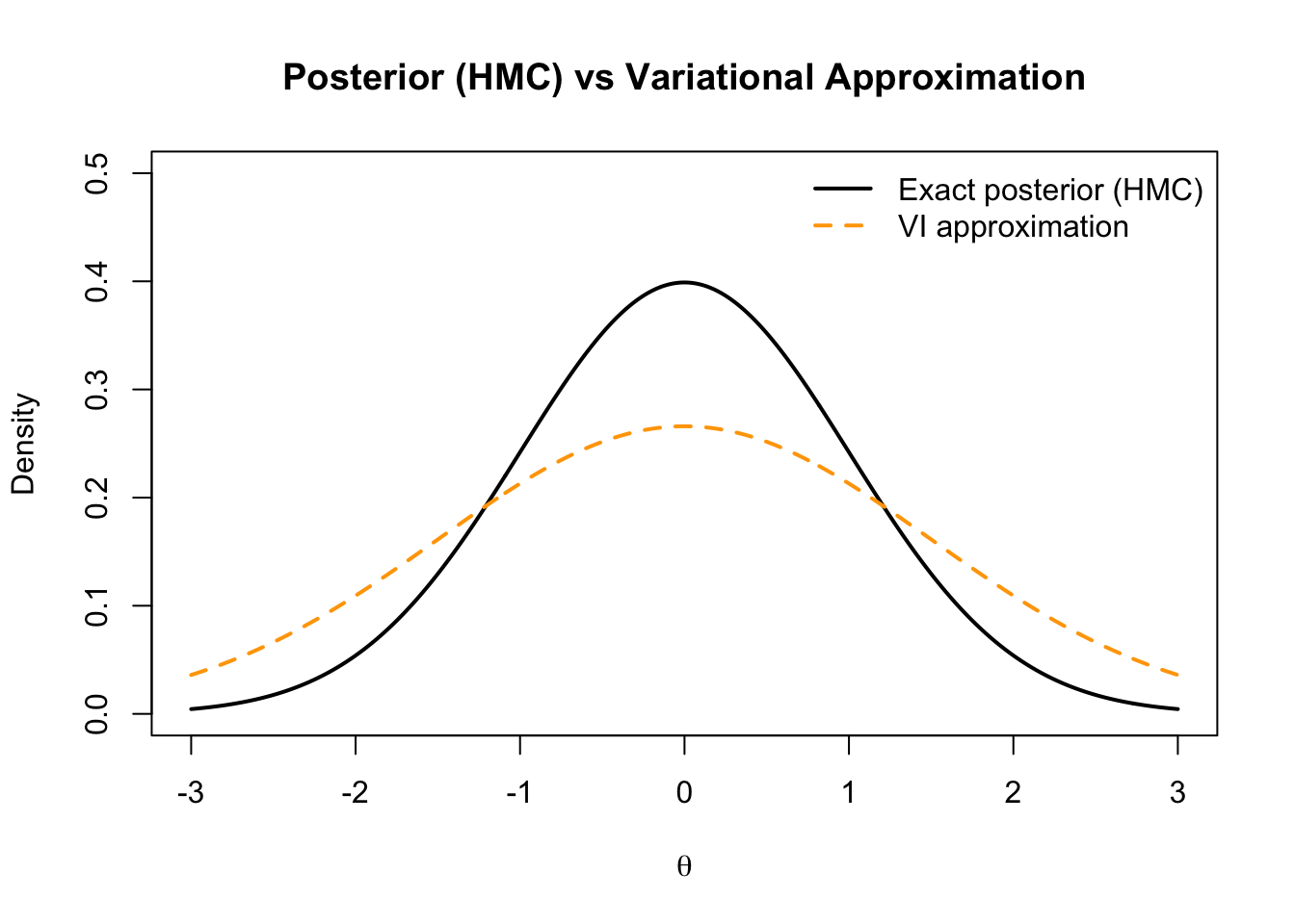 legend("topright", legend=c("Exact posterior (HMC)","VI approximation"),