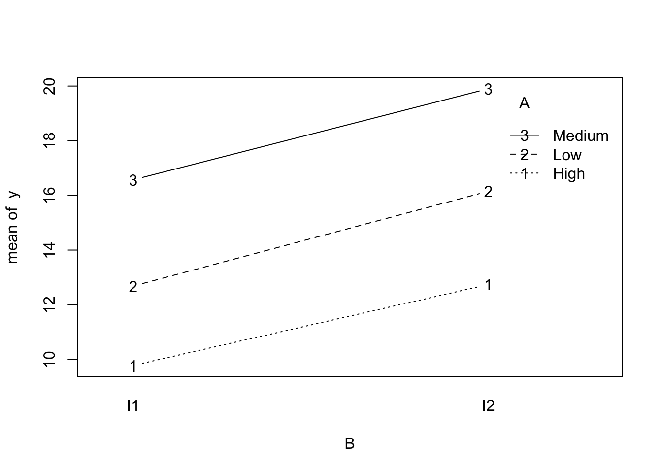 with(dat2, interaction.plot(x.factor = B, trace.factor = A, response = y,fun = mean, type ="b", legend =TRUE))