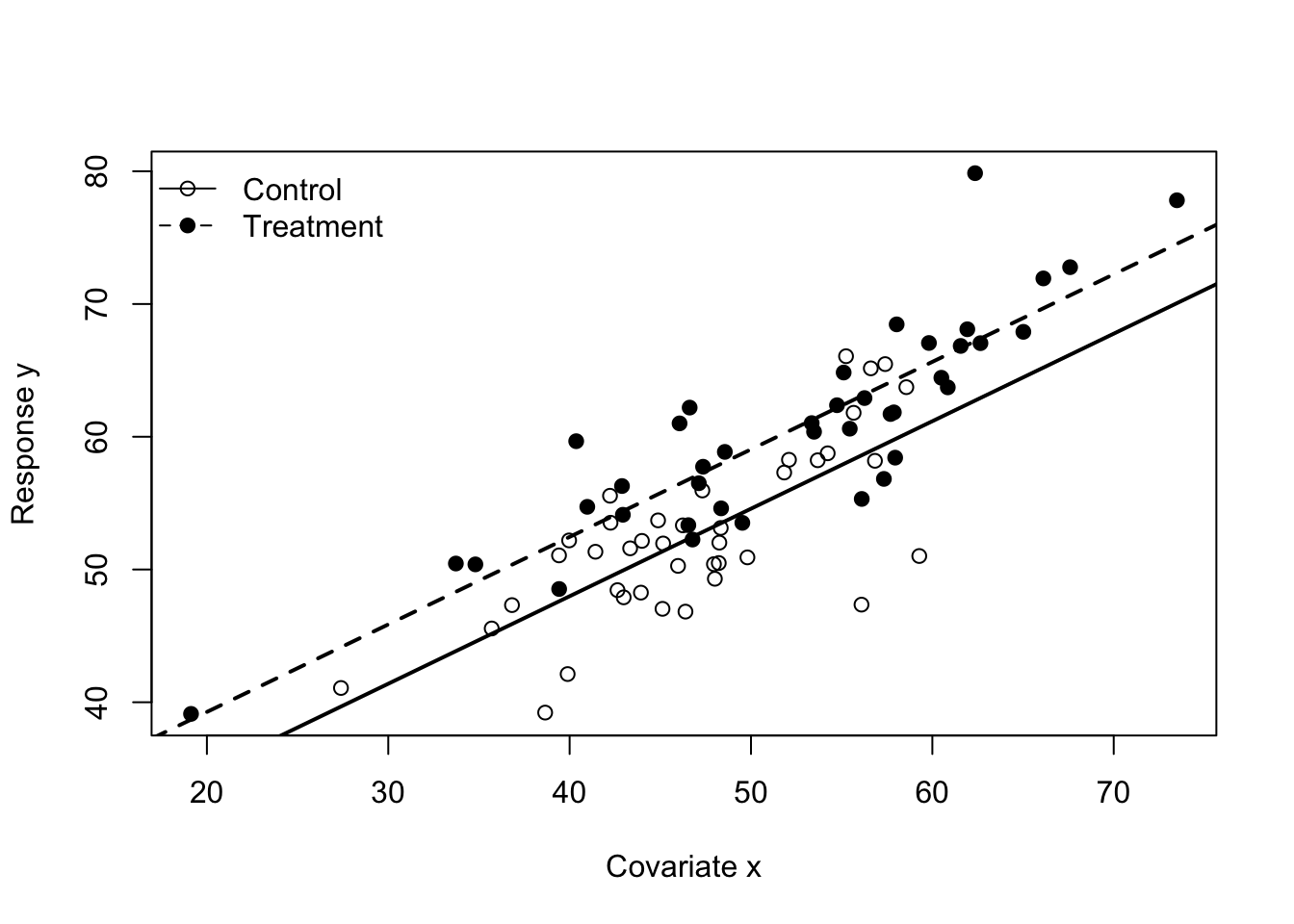set.seed(789)n <-80group3 <-factor(rep(c("Control", "Treatment"), each = n /2))x <-rnorm(n, mean =50, sd =10)y3 <-20+0.7* x +ifelse(group3 =="Treatment", 4, 0) +rnorm(n, sd =4)dat3 <-data.frame(y = y3, x = x, group = group3)fit3 <-lm(y ~ x + group, data = dat3)fit3_int <-lm(y ~ x * group, data = dat3)summary(fit3)