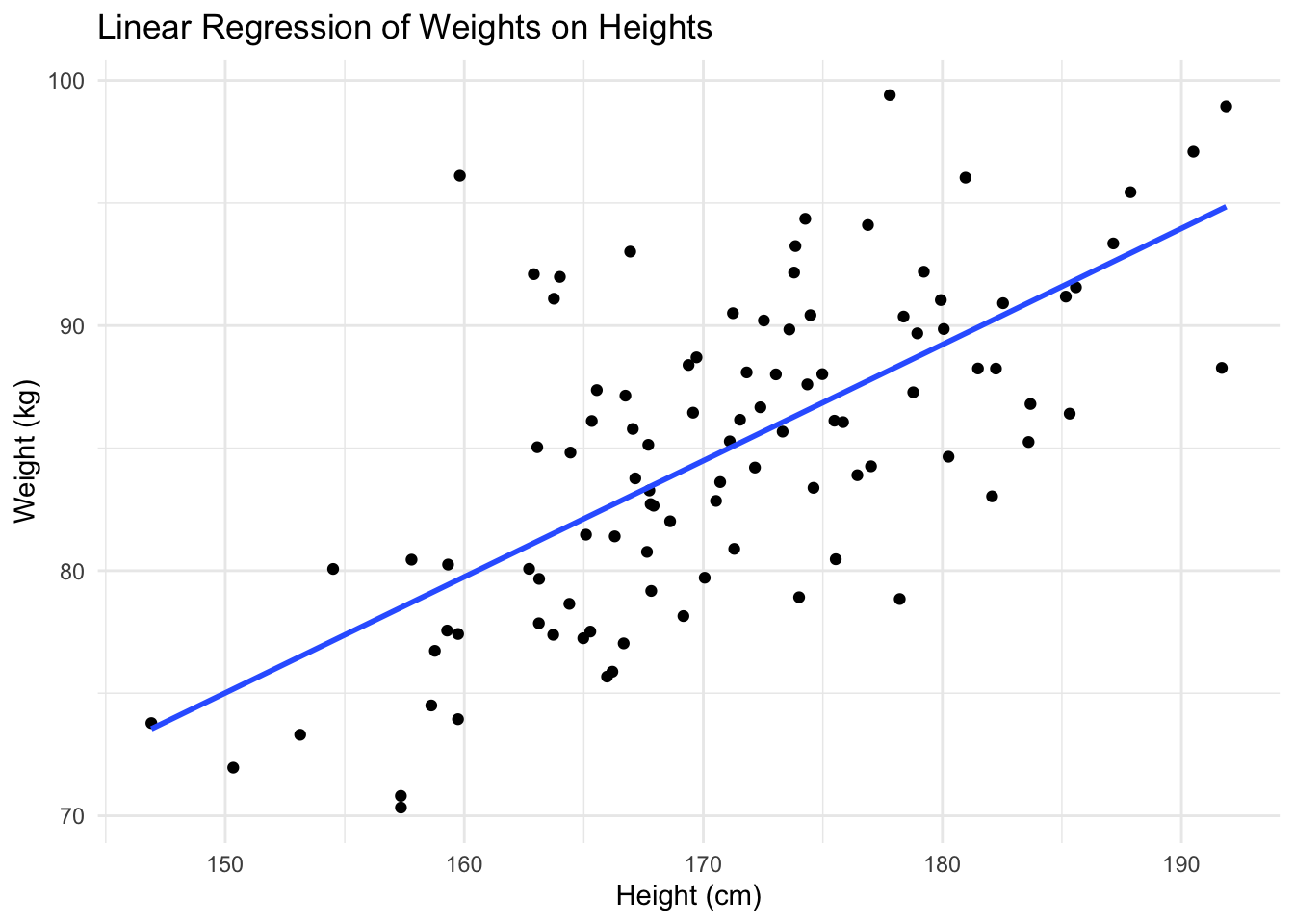 # Load necessary librarieslibrary(ggplot2)library(dplyr)# Create a sample data setset.seed(123)theme_set(theme_minimal())n <-100heights <-rnorm(n, mean =170, sd =10)weights <-0.5* heights +rnorm(n, mean =0, sd=5)data <-data.frame(heights, weights)# Fit a linear regression modelmodel <-lm(weights ~ heights, data = data)# Summarize the modelsummary(model)