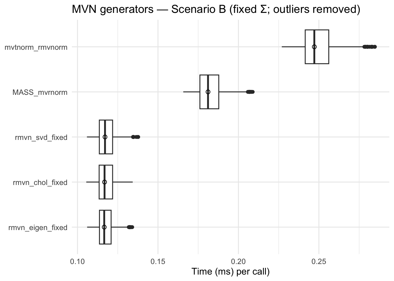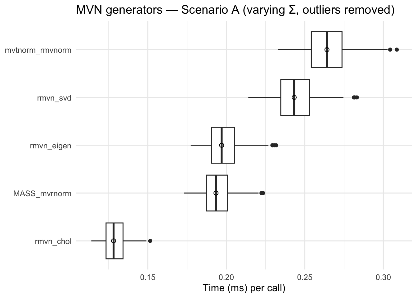 set.seed(777)n <-100# sample size per calld <-30# dimensionN <-1000# number of distinct Sigmas to cycle through in Scenario Areps_A <-200# microbenchmark repetitions for Scenario Areps_B <-500# microbenchmark repetitions for Scenario Bmu <-numeric(d)## ====== MVN generators ======rmvn_eigen <-function(n, mu, Sigma) { ev <-eigen(Sigma, symmetric =TRUE) A <- ev$vectors %*% (sqrt(pmax(ev$values, 0)) *t(ev$vectors)) Z <-matrix(rnorm(n *length(mu)), n)sweep(Z %*% A, 2, mu, `+`)}rmvn_svd <-function(n, mu, Sigma) { sv <-svd(Sigma) A <- sv$u %*% (sqrt(pmax(sv$d, 0)) *t(sv$v)) Z <-matrix(rnorm(n *length(mu)), n)sweep(Z %*% A, 2, mu, `+`)}rmvn_chol <-function(n, mu, Sigma) { R <-chol(Sigma) Z <-matrix(rnorm(n *length(mu)), n)sweep(Z %*% R, 2, mu, `+`)}## ====== Utilities ======rand_cov <-function(d) { A <-matrix(rnorm(d*d), d, d) S <-crossprod(A) / ddiag(S) <-diag(S) +1e-6 S}drop_outliers <-function(df) { df %>%group_by(expr) %>%mutate(q1 =quantile(time, 0.25),q3 =quantile(time, 0.75),iqr = q3 - q1,lower = q1 -1.5* iqr,upper = q3 +1.5* iqr ) %>%filter(time >= lower & time <= upper) %>%ungroup()}## Precompute N random SPD matrices (same pool for all methods)Sigma_list <-replicate(N, rand_cov(d), simplify =FALSE)## ====== Scenario A: varying Sigma each call (factorize every time) ======i <-0next_Sigma <-function() { i <<-if (i == N) 1else i +1; Sigma_list[[i]] }bench_A <-microbenchmark(rmvn_eigen =rmvn_eigen(n, mu, next_Sigma()),rmvn_svd =rmvn_svd(n, mu, next_Sigma()),rmvn_chol =rmvn_chol(n, mu, next_Sigma()),MASS_mvrnorm = MASS::mvrnorm(n, mu, next_Sigma()),mvtnorm_rmvnorm = mvtnorm::rmvnorm(n, mean = mu, sigma =next_Sigma()),times = reps_A)sum_A <-as.data.frame(bench_A) %>%group_by(expr) %>%summarize(median_ms =median(time)/1e6,iqr_ms =IQR(time)/1e6,.groups ="drop") %>%arrange(median_ms) %>%mutate(scenario ="A: varying Σ")print(sum_A)
