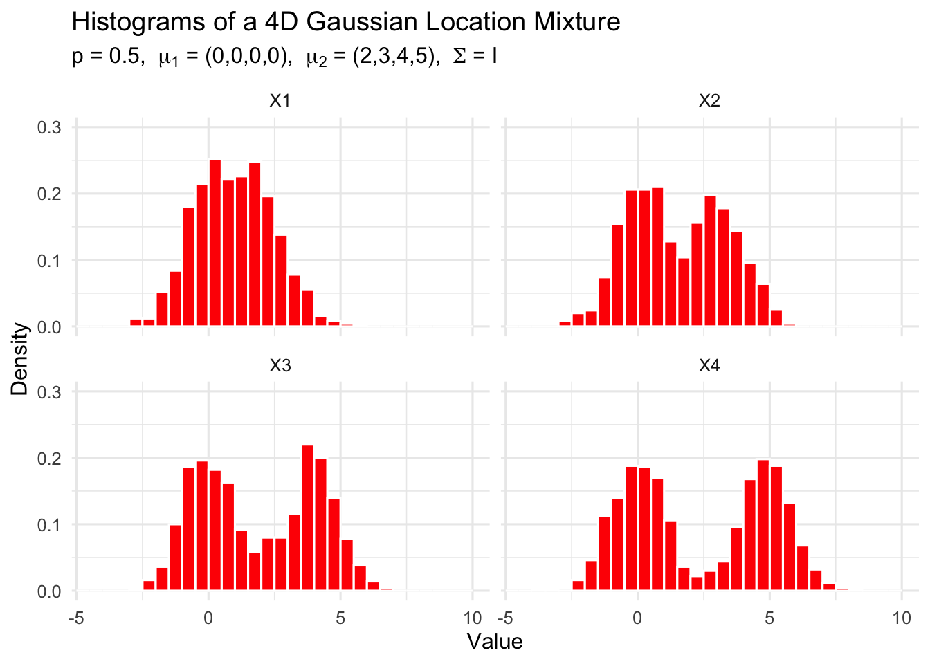 It is difficult to visualize data in \(R^d\), for \(d\ge 4\), so we display only the histograms of the marginal distributions. All of the one-dimensional marginal distributions are univariate normal location mixtures.