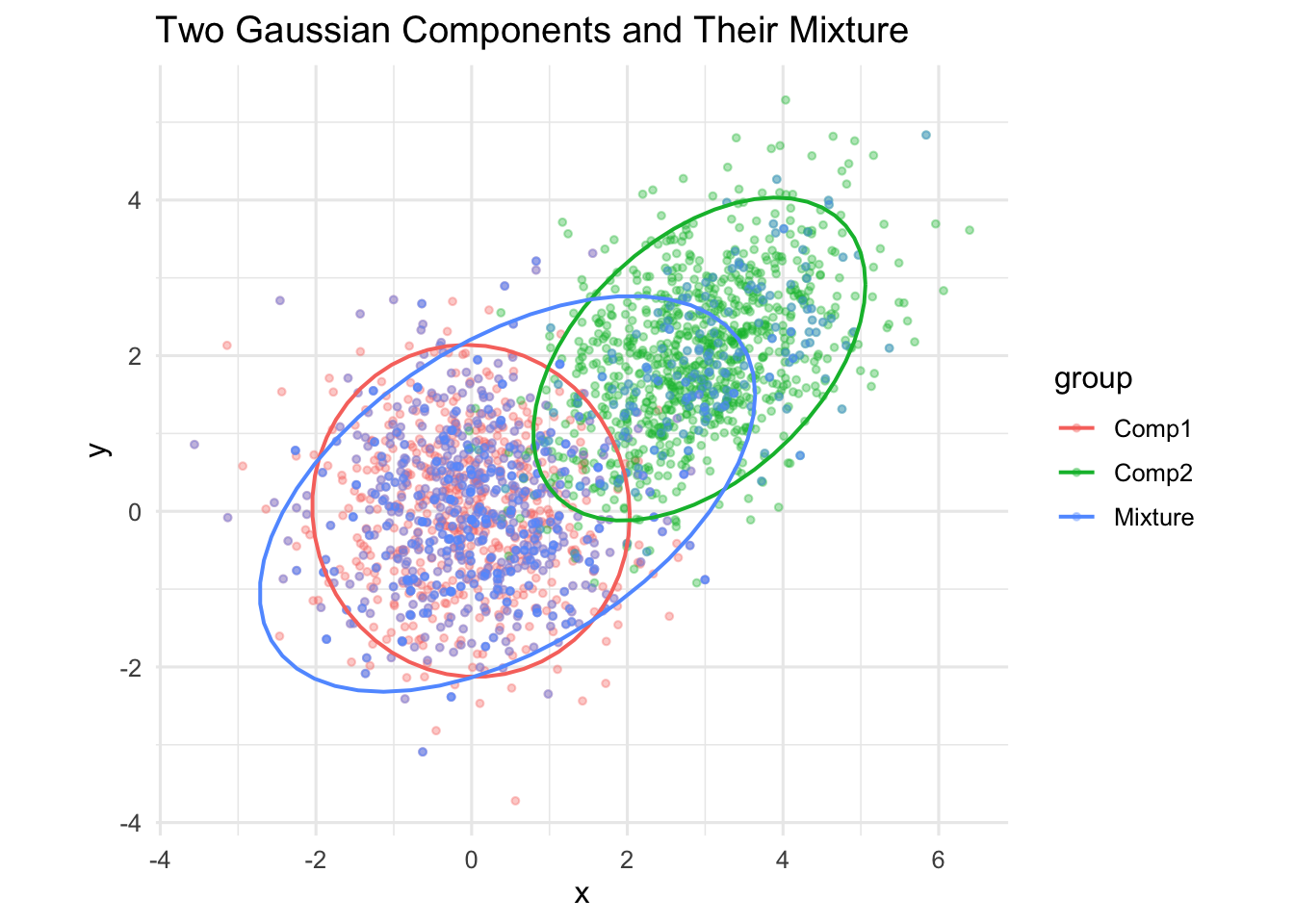 set.seed(777)n <-1000comp1 <- MASS::mvrnorm(n, mu =c(0, 0), Sigma =diag(2))comp2 <- MASS::mvrnorm(n, mu =c(3, 2), Sigma =matrix(c(1, 0.5, 0.5, 1), 2))# Proper mixture membership per observationalpha <-1-1/2*(1-sqrt(3)/3 ) # P(Comp1)memb <-rbinom(n, 1, alpha) # 1 = Comp1, 0 = Comp2# Build the mixture matrix row-wise (avoid ifelse on matrices)mix <-matrix(NA_real_, nrow = n, ncol =2)id1 <- memb ==1id2 <-!id1mix[id1, ] <- comp1[sample(n, sum(id1), replace =TRUE), ]mix[id2, ] <- comp2[sample(n, sum(id2), replace =TRUE), ]# Tidy data frames with labelsdf1 <-data.frame(x = comp1[,1], y = comp1[,2], group ="Comp1")df2 <-data.frame(x = comp2[,1], y = comp2[,2], group ="Comp2")dfm <-data.frame(x = mix[,1], y = mix[,2], group ="Mixture")df_all <-rbind(df1, df2, dfm)# Option A: single panel, colored by groupp1 <-ggplot(df_all, aes(x, y, color = group)) +geom_point(alpha =0.35, size =1) +stat_ellipse(level =0.95, linewidth =0.7) +coord_equal() +theme_minimal(base_size =12) +labs(title ="Two Gaussian Components and Their Mixture")p1