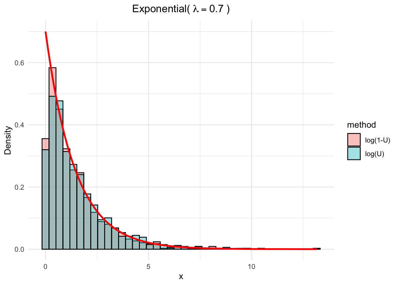 set.seed(777)N <-1000lambda <-0.7uVec <-runif(N)xVec_1 <-- (1/lambda) *log(uVec)xVec_2 <-- (1/lambda) *log(1-uVec)# Put data into long format for ggplotdf <-data.frame(value =c(xVec_1, xVec_2),method =rep(c("log(U)", "log(1-U)"), each = N))# Theoretical density functionexp_density <-function(x) lambda *exp(-lambda * x)# Plotggplot(df, aes(x = value, fill = method)) +geom_histogram(aes(y = ..density..), bins =40,position ="identity", alpha =0.4, color ="black") +stat_function(fun = exp_density, color ="red", size =1) +labs(title =bquote("Exponential("~ lambda == .(lambda) ~")"),x ="x", y ="Density")