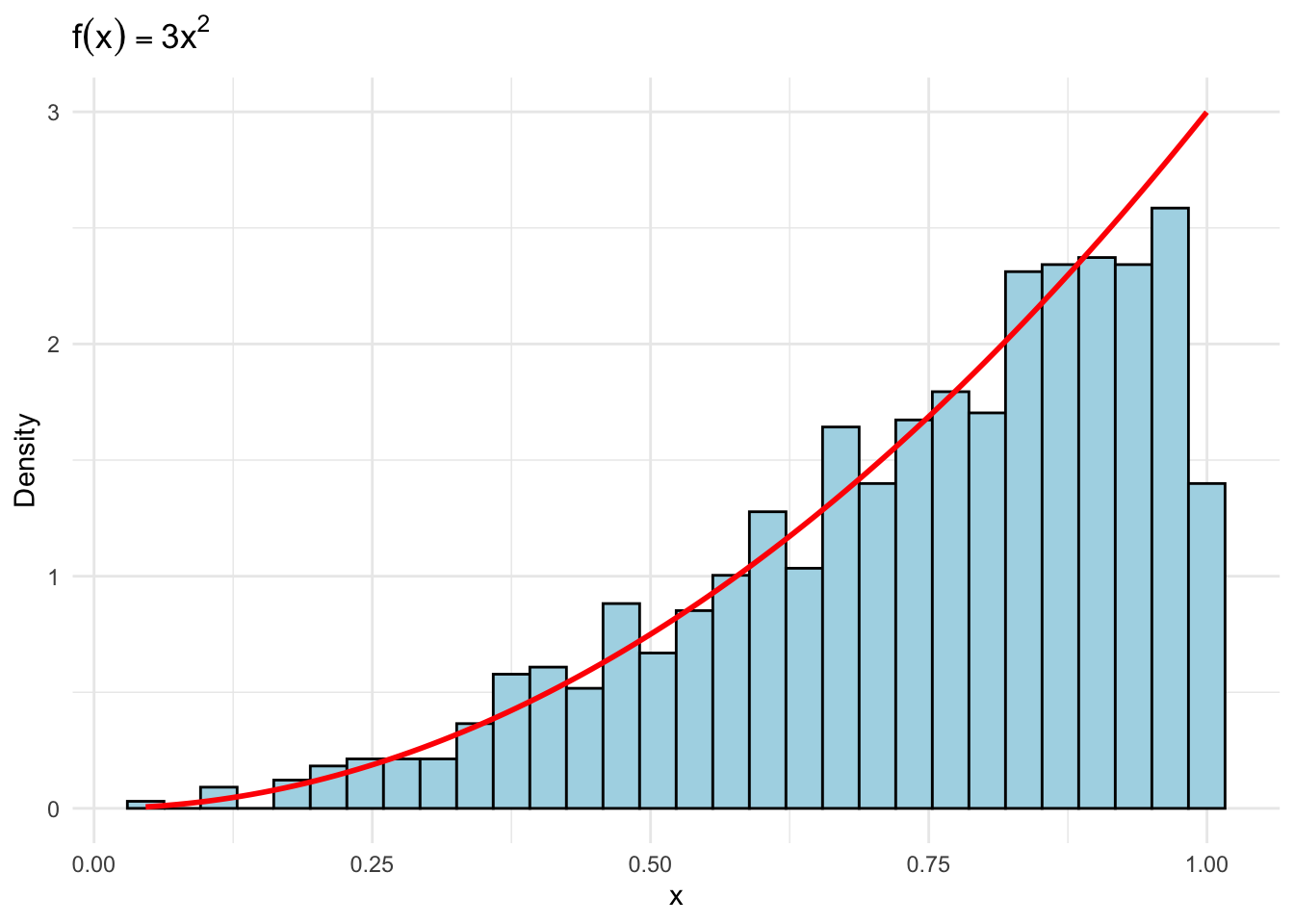 set.seed(777)N <-1000uVec <-runif(N)xVec <- uVec^(1/3)df <-data.frame(x = xVec)# Density histogram with theoretical density overlayggplot(df, aes(x)) +geom_histogram(aes(y = ..density..), bins =30,fill ="lightblue", color ="black") +stat_function(fun =function(x) 3*x^2,color ="red", size =1) +labs(title =expression(f(x) ==3*x^2),y ="Density", x ="x") +theme_minimal()