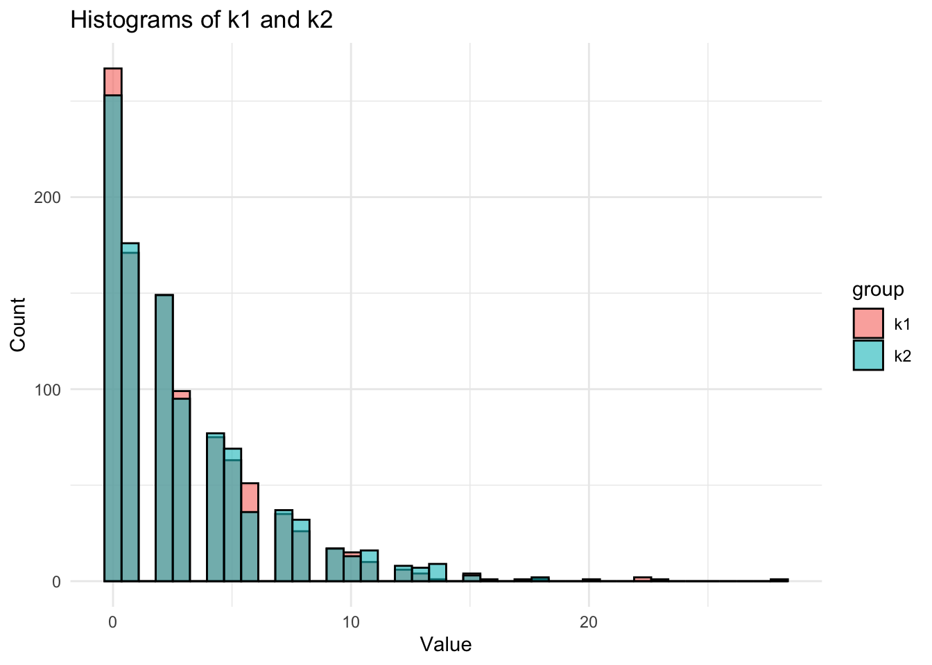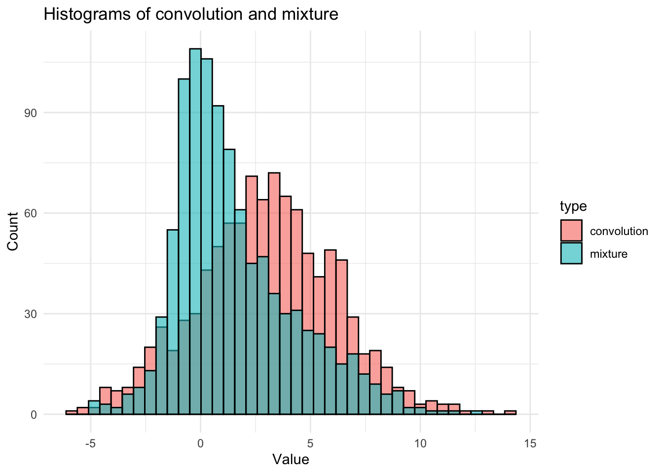 n <-1000x1 <-rnorm(n, 0, 1)x2 <-rnorm(n, 3, 3)s_convolution <- x1 + x2 #the convolutionu <-runif(n)k <-as.integer(u >0.5) #vector of 0’s and 1’s## pay attention to itm_mixture <- k * x1 + (1-k) * x2 #the mixturedf <-data.frame(value =c(s_convolution, m_mixture),type =rep(c("convolution", "mixture"), each = n))ggplot(df, aes(x = value, fill = type)) +geom_histogram(alpha =0.6, position ="identity", bins =40, color ="black") +labs(title ="Histograms of convolution and mixture", x ="Value", y ="Count") +theme_minimal()