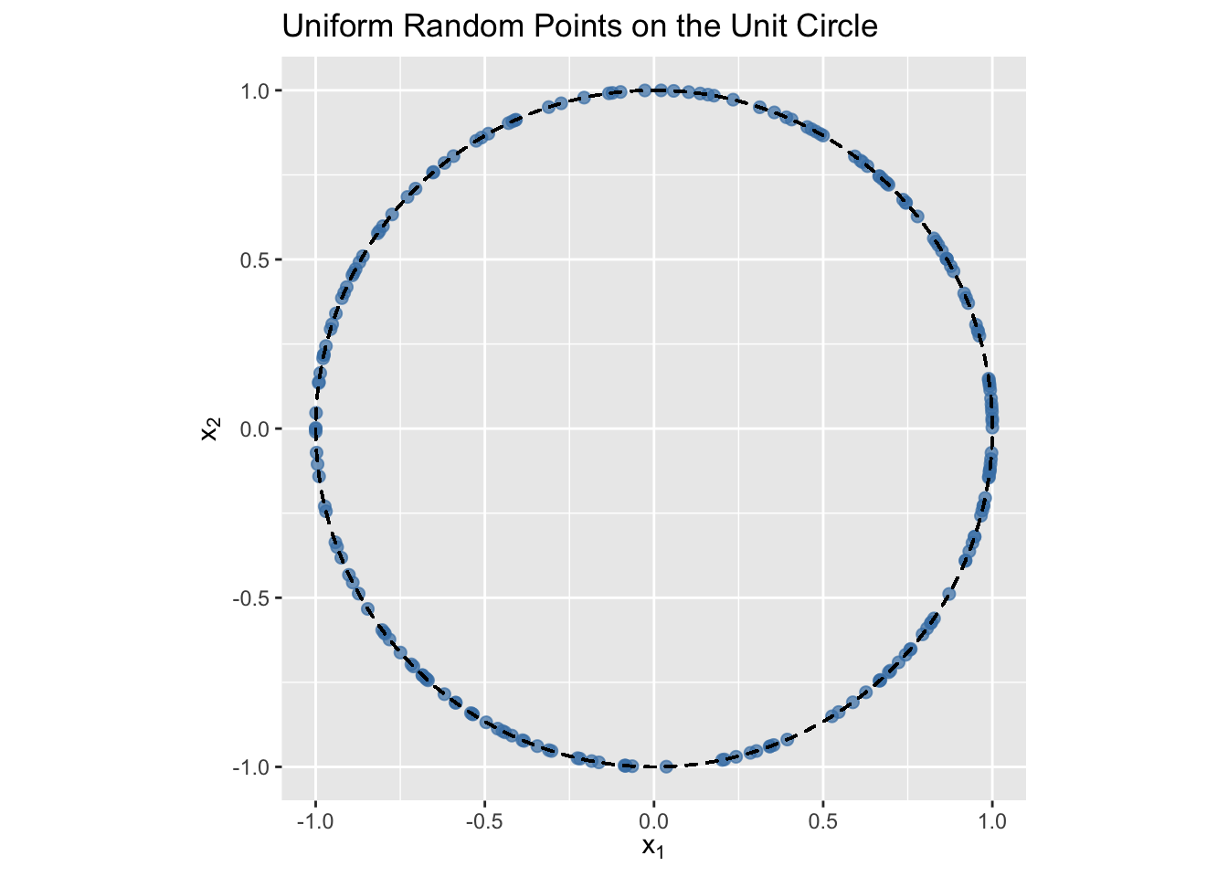 runif.sphere <-function(n, d) {# return a random sample uniformly distributed# on the unit sphere in R ^d M <-matrix(rnorm(n * d), nrow = n, ncol = d) L <-apply(M,MARGIN =1,FUN =function(x) {sqrt(sum(x * x)) } ) D <-diag(1/ L) U <- D %*% M U}#generate a sample in d=2 and plotX_d2 <-runif.sphere(200, 2)df <-data.frame(x1 = X_d2[,1], x2 = X_d2[,2])ggplot(df, aes(x = x1, y = x2)) +geom_point(color ="steelblue", size =2, alpha =0.7) +coord_equal() +labs(x =expression(x[1]),y =expression(x[2]),title ="Uniform Random Points on the Unit Circle" ) + ggforce::geom_circle(aes(x0 =0, y0 =0, r =1), inherit.aes =FALSE,color ="black", linetype ="dashed")