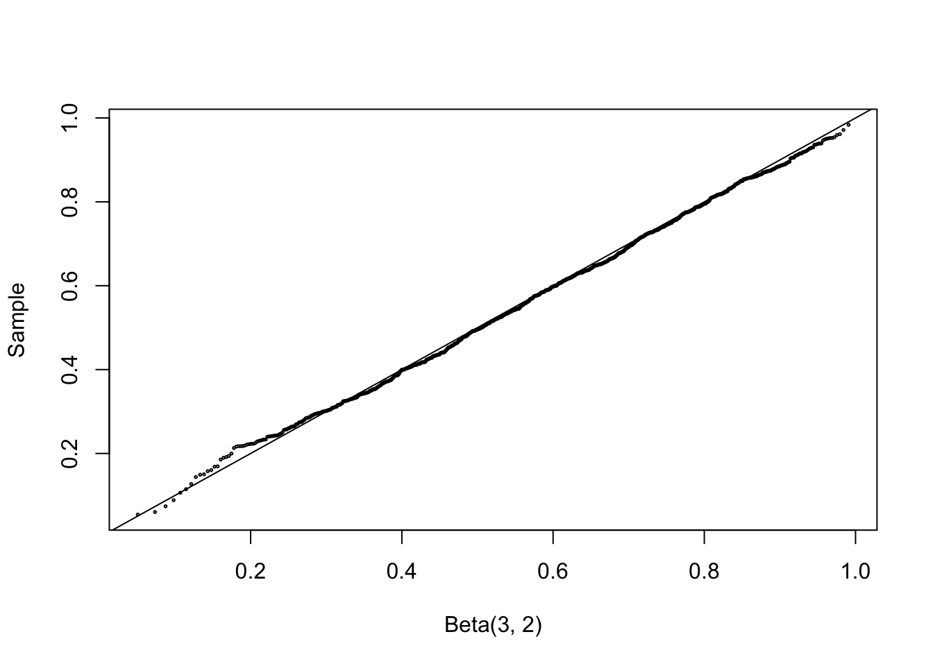 The sample data can be compared with the Beta\((3,2)\) distribution using a quantile–quantile (QQ) plot. If the sampled distribution is Beta\((3,2)\), the QQ plot should be nearly linear.