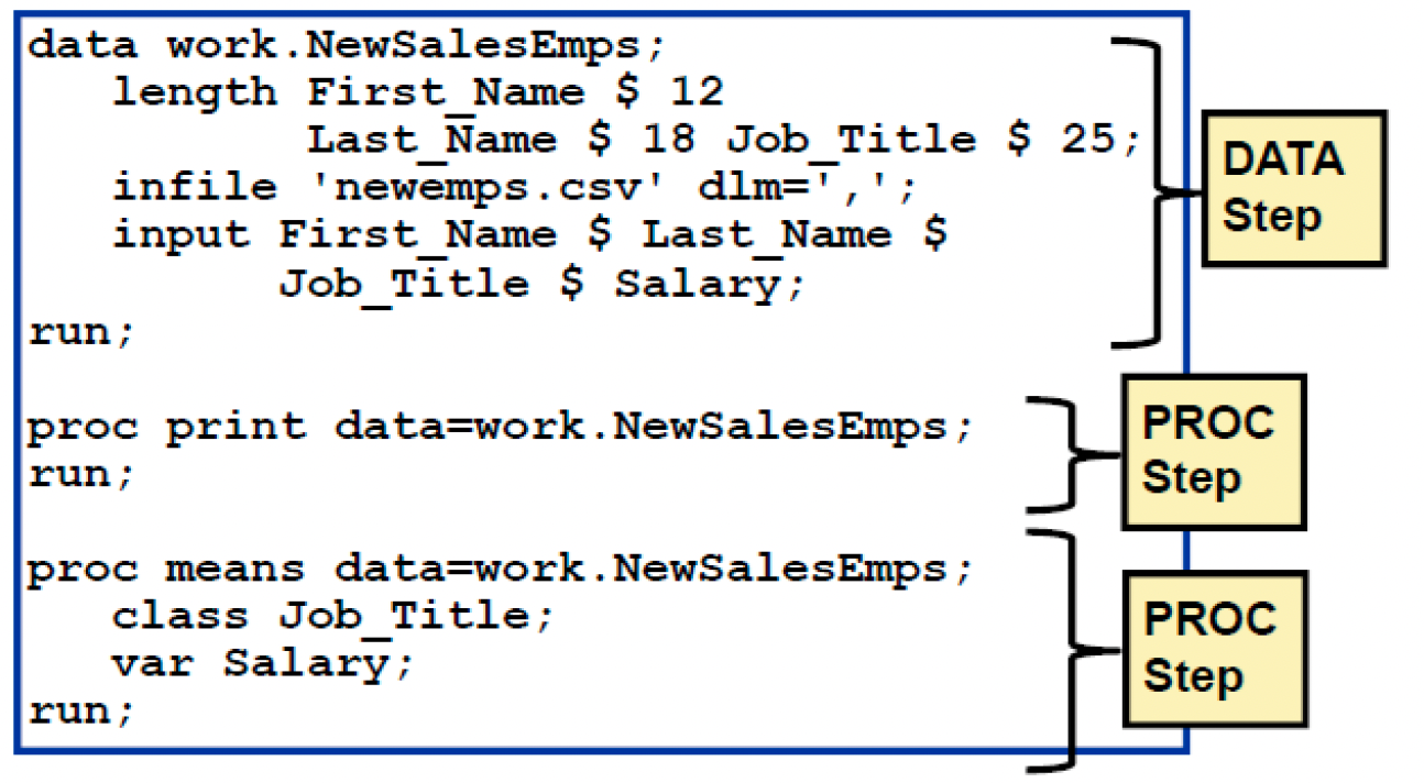 In general, writing a SAS program is to write a sequence of steps, and a step is a sequence of SAS statements: