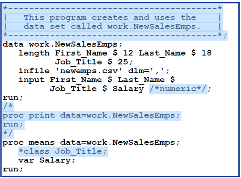 Sometimes we may want to make comments/notes to easy remember our SAS statements or to let other people easily understand what our code want to say. These comments are text that SAS ignores during processing. You can use comments anywhere in a SAS program to document the purpose of the program, explain segments of the program, or mark SAS code as non-executing text.