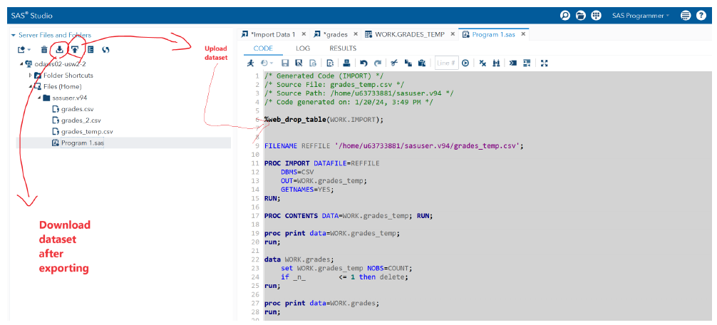 RUN;The IMPORT statement reads the dataset and stores it as the value designated by “OUT” in this case it will be saved as “Grades” in the library “Work”.