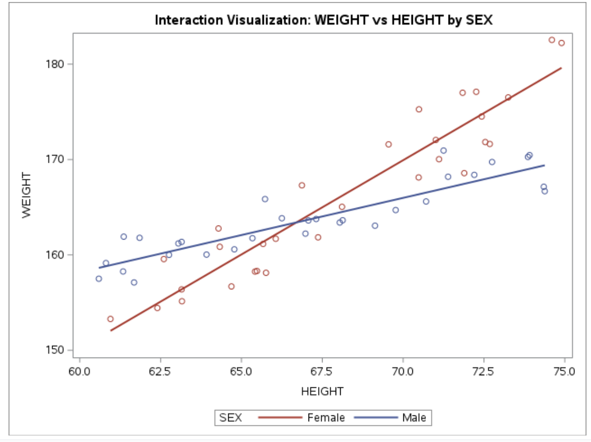 TITLE "Interaction Visualization: WEIGHT vs HEIGHT by SEX";