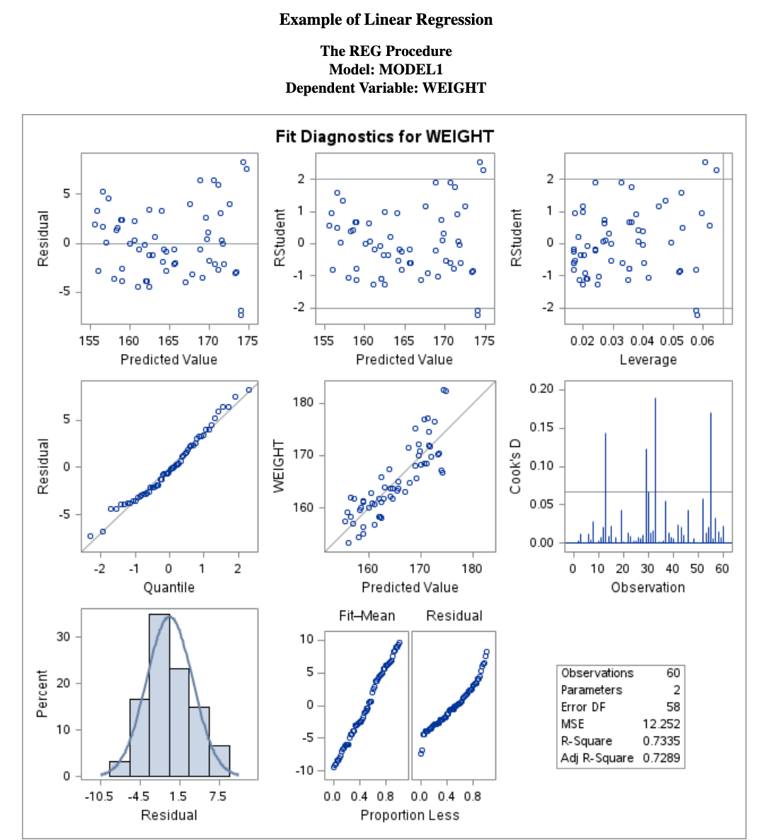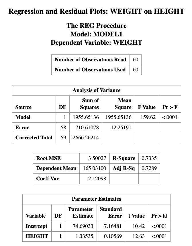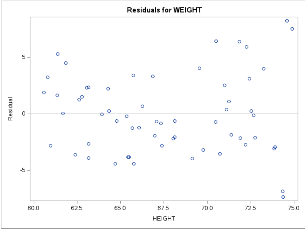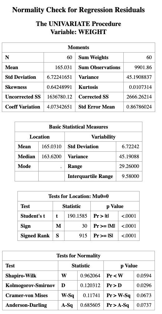 PROC REGfits the linear regression model relating weight to height.OUTPUT OUT=MYOUT R=RESIDsaves the residual values from the regression model into a new dataset calledMYOUT.PROC UNIVARIATEis used to examine the distribution of the residuals.QQPLOT RESIDproduces a Q–Q plot to visually assess whether the residuals follow a normal distribution.