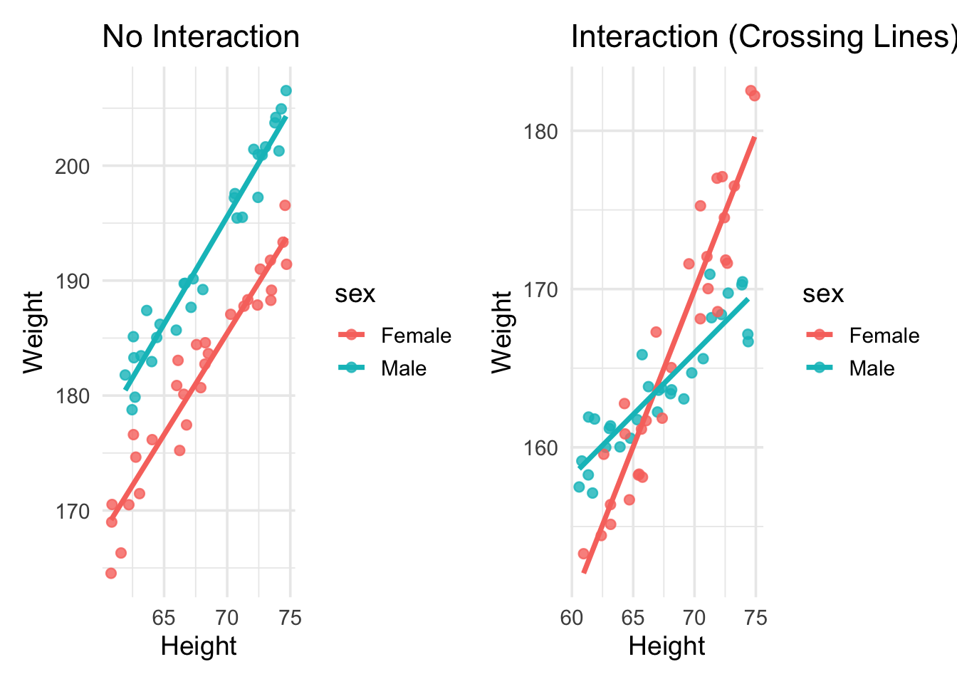 Thus, the main-effects model assumes that the effect of height is the same for both males and females. However, if the effect of height differs by sex, then we need an interaction term.